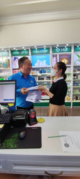 Đại diện công ty mỹ phẩm Lady1 gửi trao 290 phần quà là phiếu mua hàng cho Chủ Tịch Liên Đoàn Lao Động Đức Trọng.